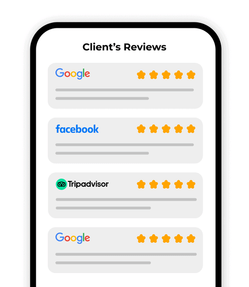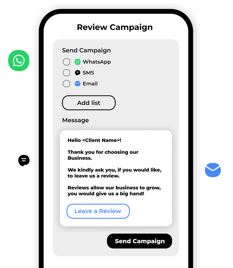 Send review requests to clients' lists via Email, WhatsApp, SMS. Or simply expose a QR Code in loco.